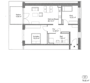 Diese attraktive 3-Zimmerwohnung im 1. Obergeschoss überzeugt durch ihre großzügige Raumaufteilung, moderne Ausstattung und den hohen Wohnkomfort eines Neubaus. Auf einer Wohnfläche von ca. 79,92 m² bietet sie ein helles, freundliches Ambiente und eine optimale Raumaufteilung für Singles, Paare oder kleine Familien.