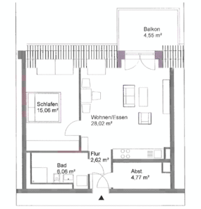 Der durchdachte Grundriss schafft eine klare Trennung von Wohn- und Schlafbereich. Der Balkon bietet zusätzlichen Raum zum Entspannen im Freien.