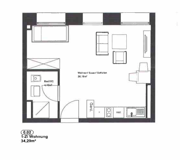 Die 1-Zimmer-Wohnung mit einer Gesamtfläche von 34,29 m² befindet sich im Erdgeschoss eines gepflegten Mehrfamilienhauses. Sie ist ideal für Singles oder Paare und bietet eine durchdachte Raumaufteilung.