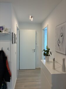 Die Gestaltung der Wohnräume erfüllt höchste Ansprüche an Komfort und Ästhetik. Hell verputzte Wände schaffen eine freundliche Atmosphäre, die durch Design-Vinylböden mit Echtholz-Dekor abgerundet wird. Eine Fußbodenheizung sorgt für besonders angenehmes Barfußgehen und steigert die Behaglichkeit in den eigenen vier Wänden.